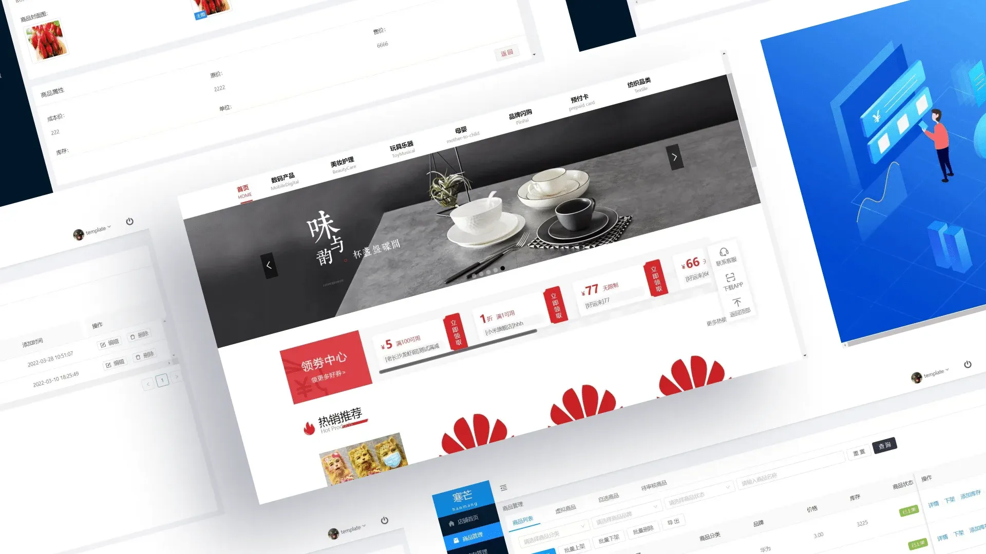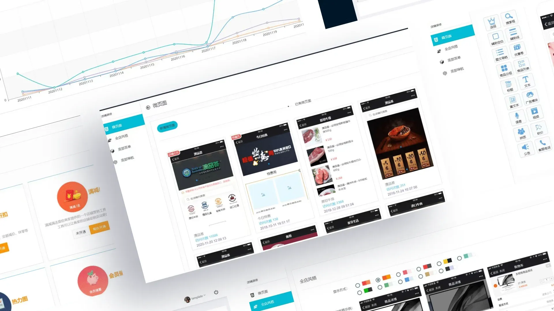 实现网页自定义前端配置组件、样式、模板,轻松构建商户前端展示页面,并且可根据运营主题快速更换。